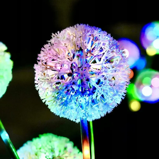 Садовий ліхтар на сонячній батареї у формі кульбаби — це яскравий декоративний елемент, який створює справжню магію у вашому саду. Завдяки RGB-підсвітці світильник змінює кольори, створюючи ефект казкового сяйва.